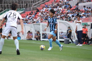 キックオフ直後からピッチを支配したのは青き戦士たち、FC大阪。前線からのプレスがよく効いており、福島ユナイテッドに自由を与えず。